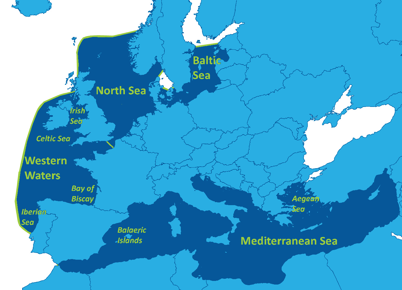 The Western waters region covers diverse areas from the exposed Iberian Seas in the south to the semi-enclosed Irish Sea in the north.